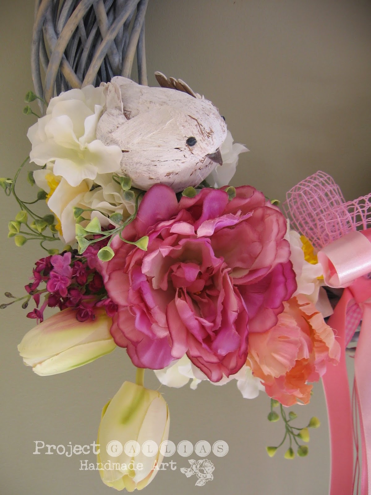 Dzisiejszy wianek na przekór aurze za oknem jest kolorowy i radosny. Wykonany jest z barwionej na szaro wikliny, przyozdobiony mnóstwem wiosennych kwiatów, wstążkami, ptaszkami oraz koszyczkiem z jajeczkami. Wszystko w tonacji biało-różowo-fioletowej.